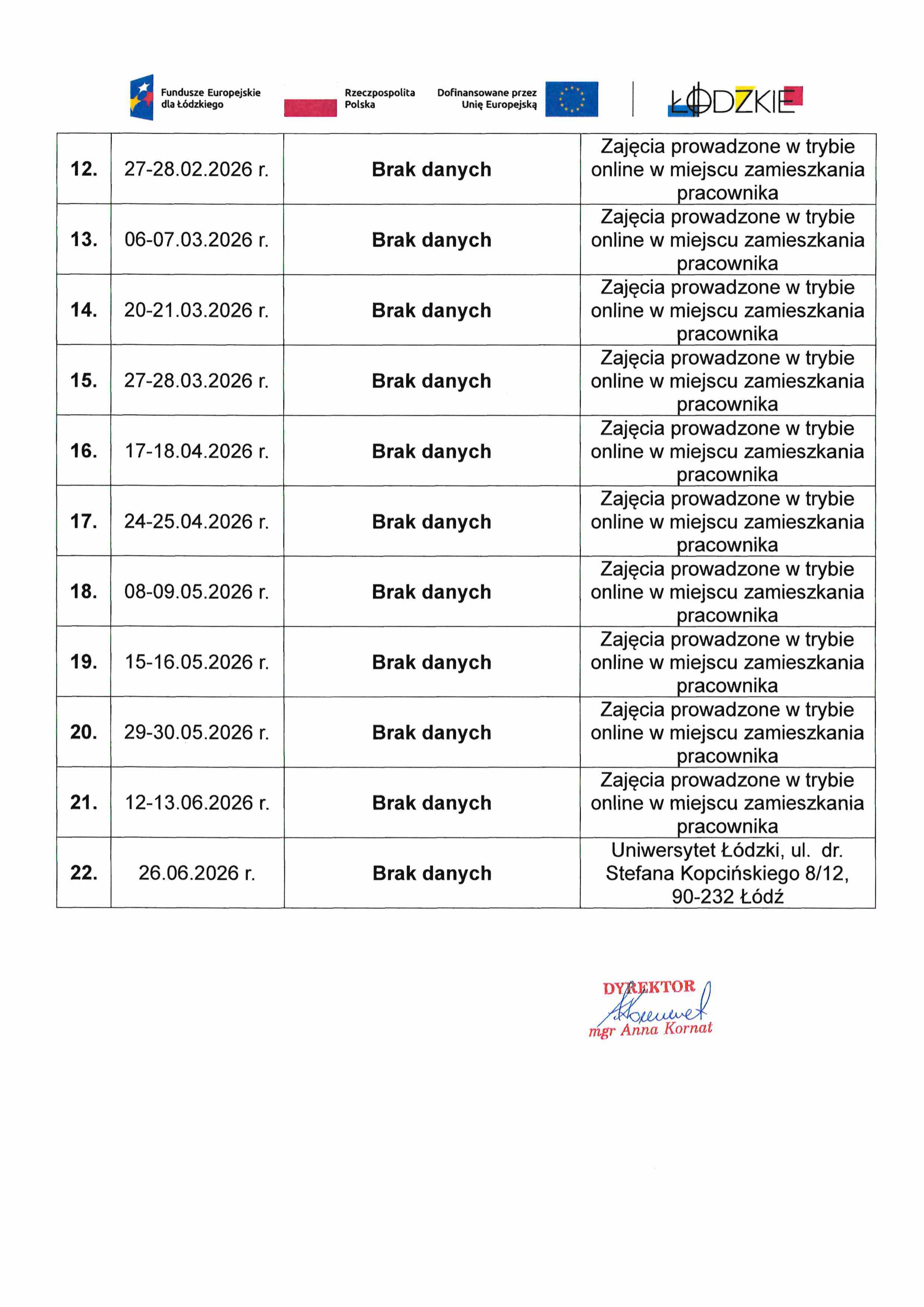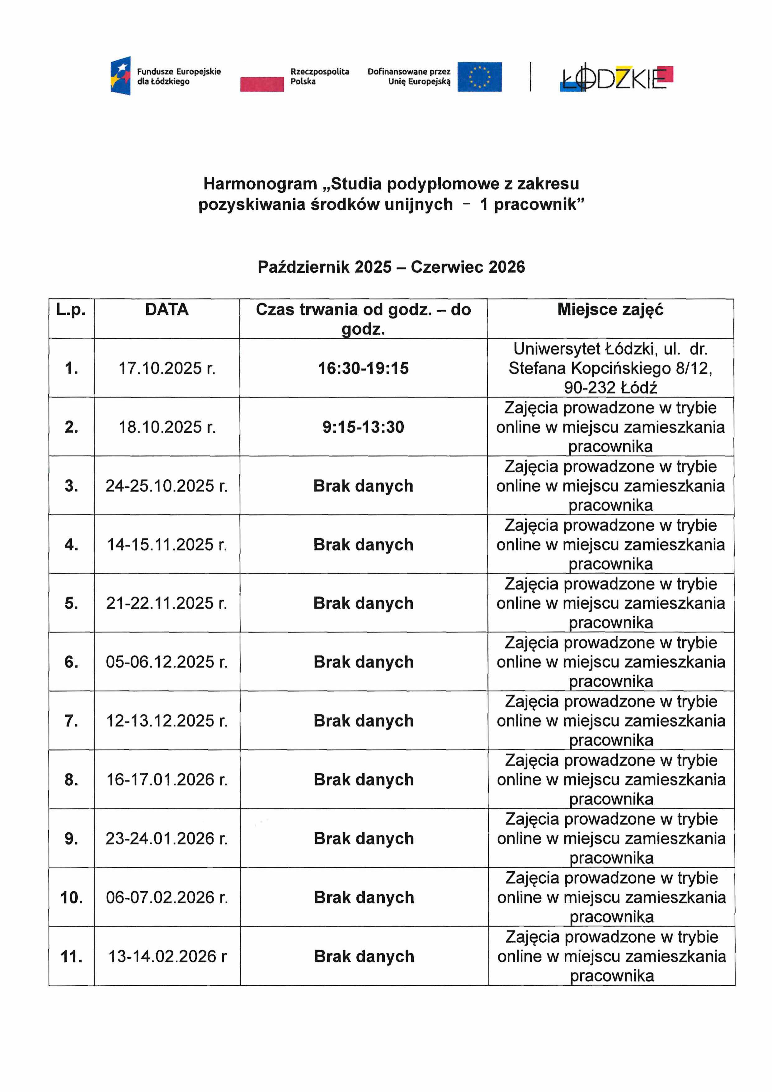 Harmonogram "Studia podyplomowe z zakresu pozyskiwania środków unijnych - 1 pracownik"