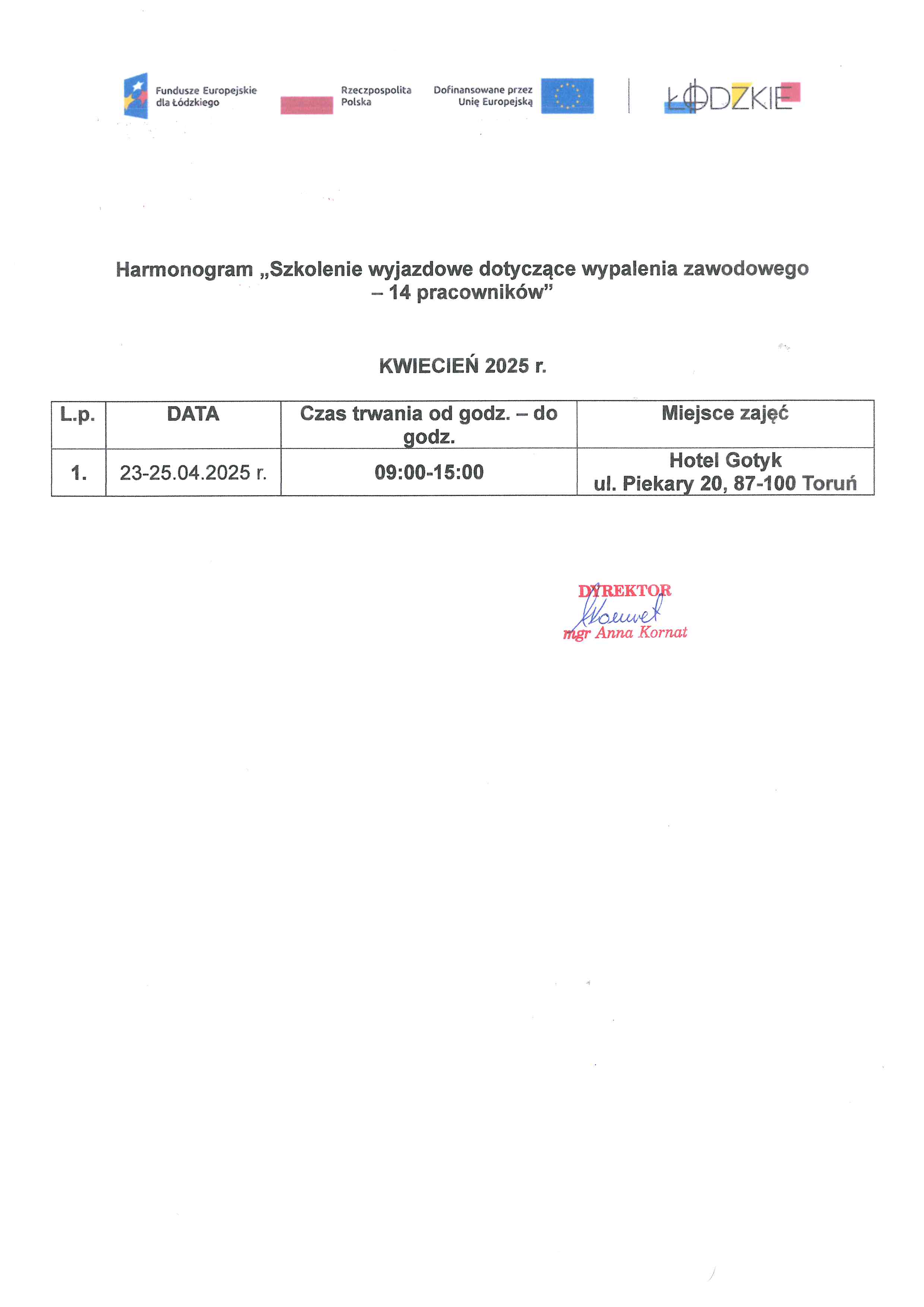 Harmonogram „Szkolenie wyjazdowe dotyczące wypalenia zawodowego – 14 pracowników”
