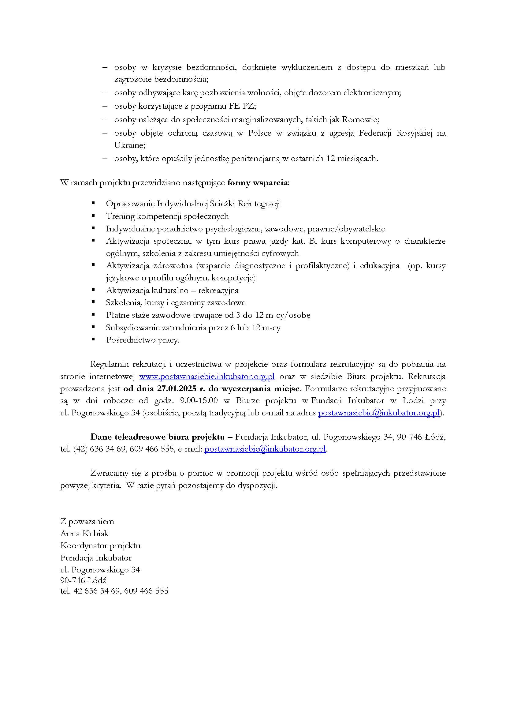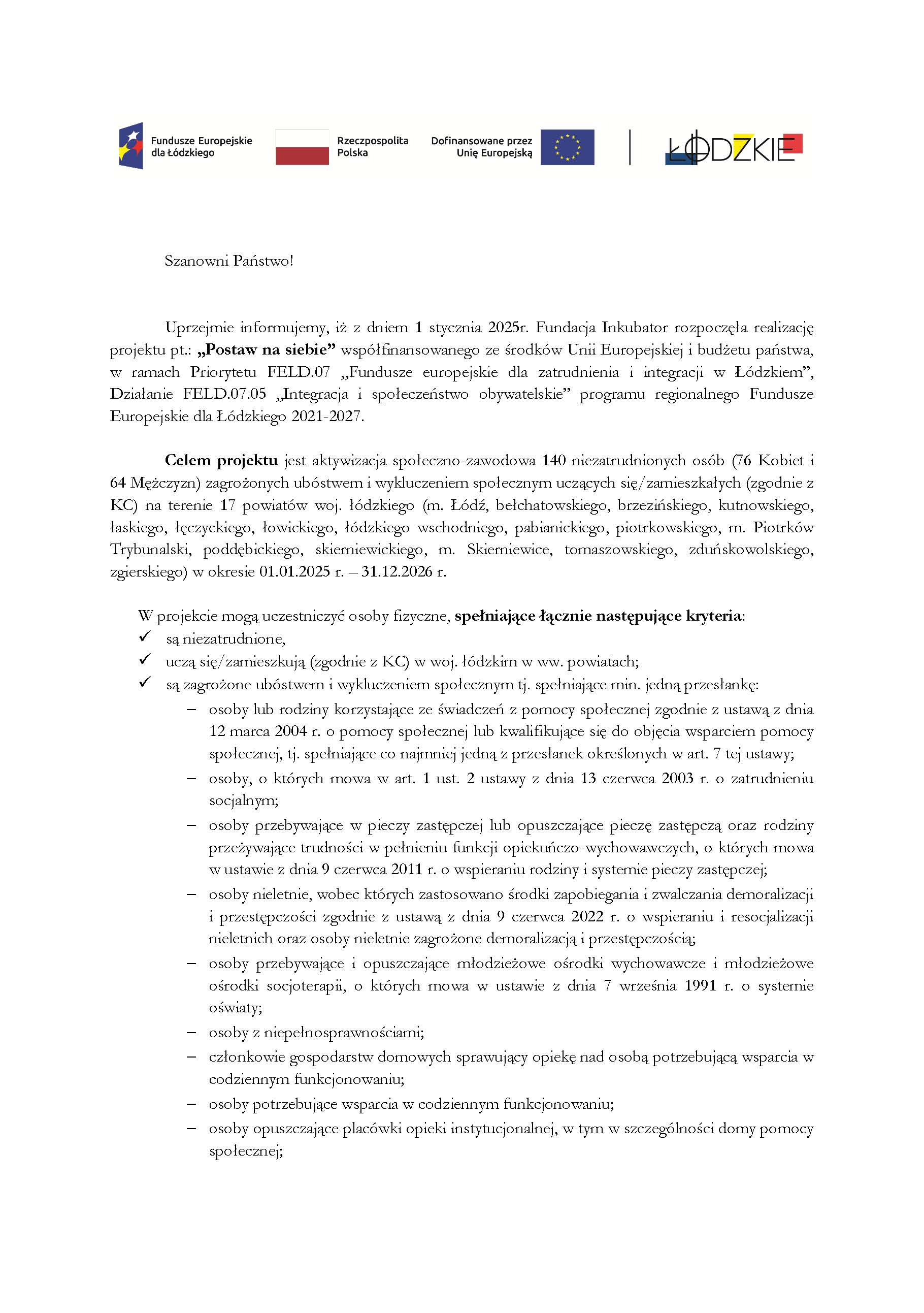 Informacja dotycząca rozpoczęcia rekrutacji do unijnego projektu „Postaw na siebie” realizowanego przez Fundację Inkubator z siedzibą w Łodzi.