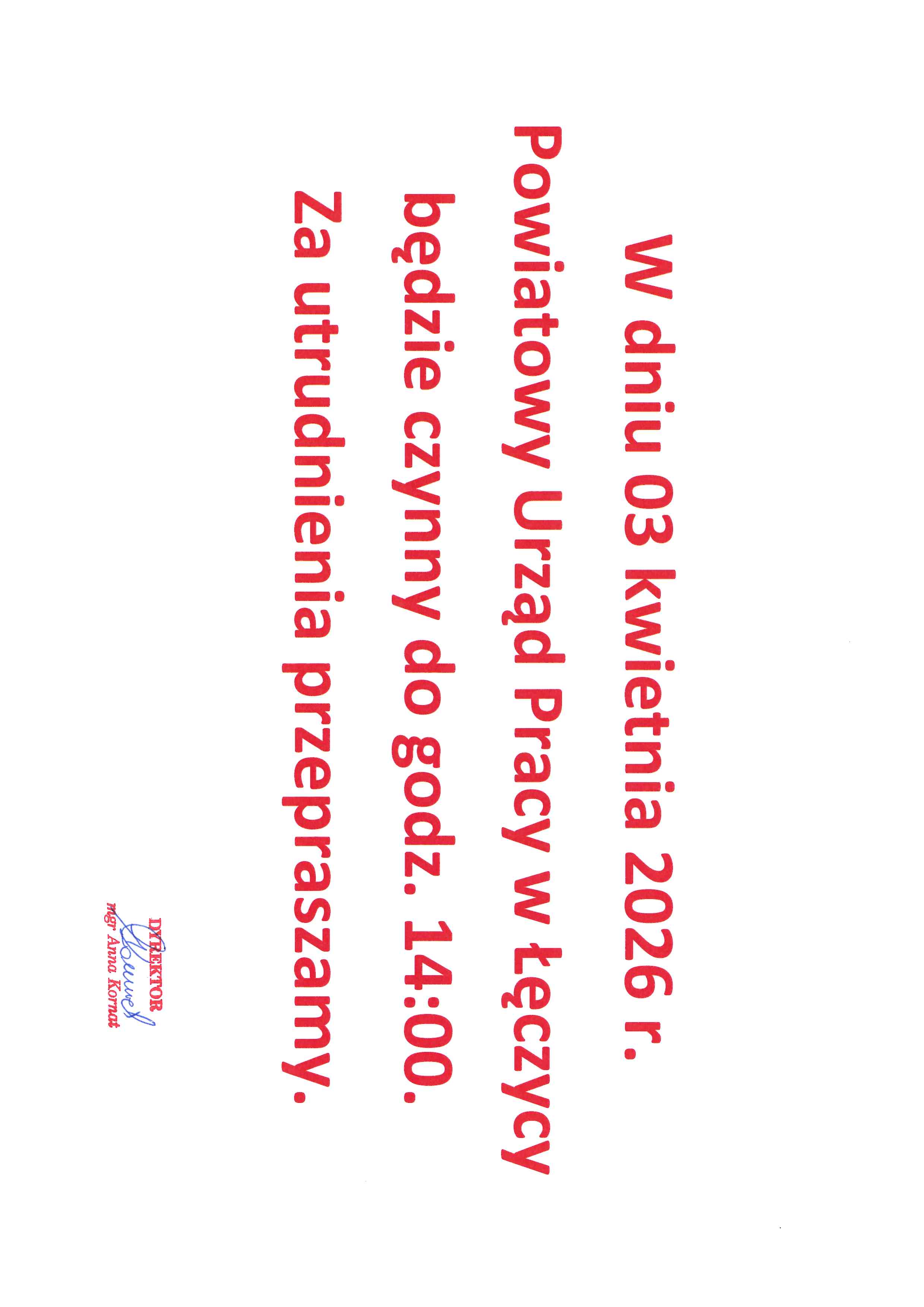W dniu 3 kwietnia 2026 r. Powiatowy Urząd Pracy w Łęczycy będzie czynny do godziny 14:00